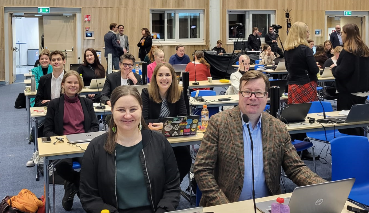Kuvassa vasemmistoliiton valtuustoryhmä Tampereen talousarviokokouksessa 10.11.2025. Valtuutettu Hanhela kuvassa keskellä.